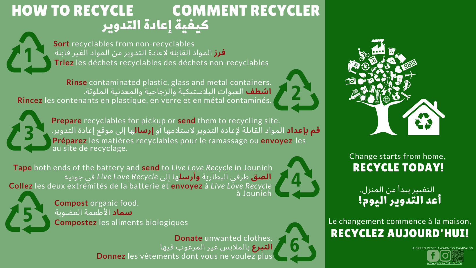 (En) Green Vests is a grassroot initiative that focuses on the encouragement and development of a healthy, sustainable, and environmentally friendly community starting in the Jdeidet-Ghazir and Qattine region.(Fr) Green Vests est une initiative de base qui se concentre sur l'encouragement et le développement d'une communauté saine, durable et respectueuse de l'environnement à partir de la région de Jdeidet-Ghazir et Qattine.