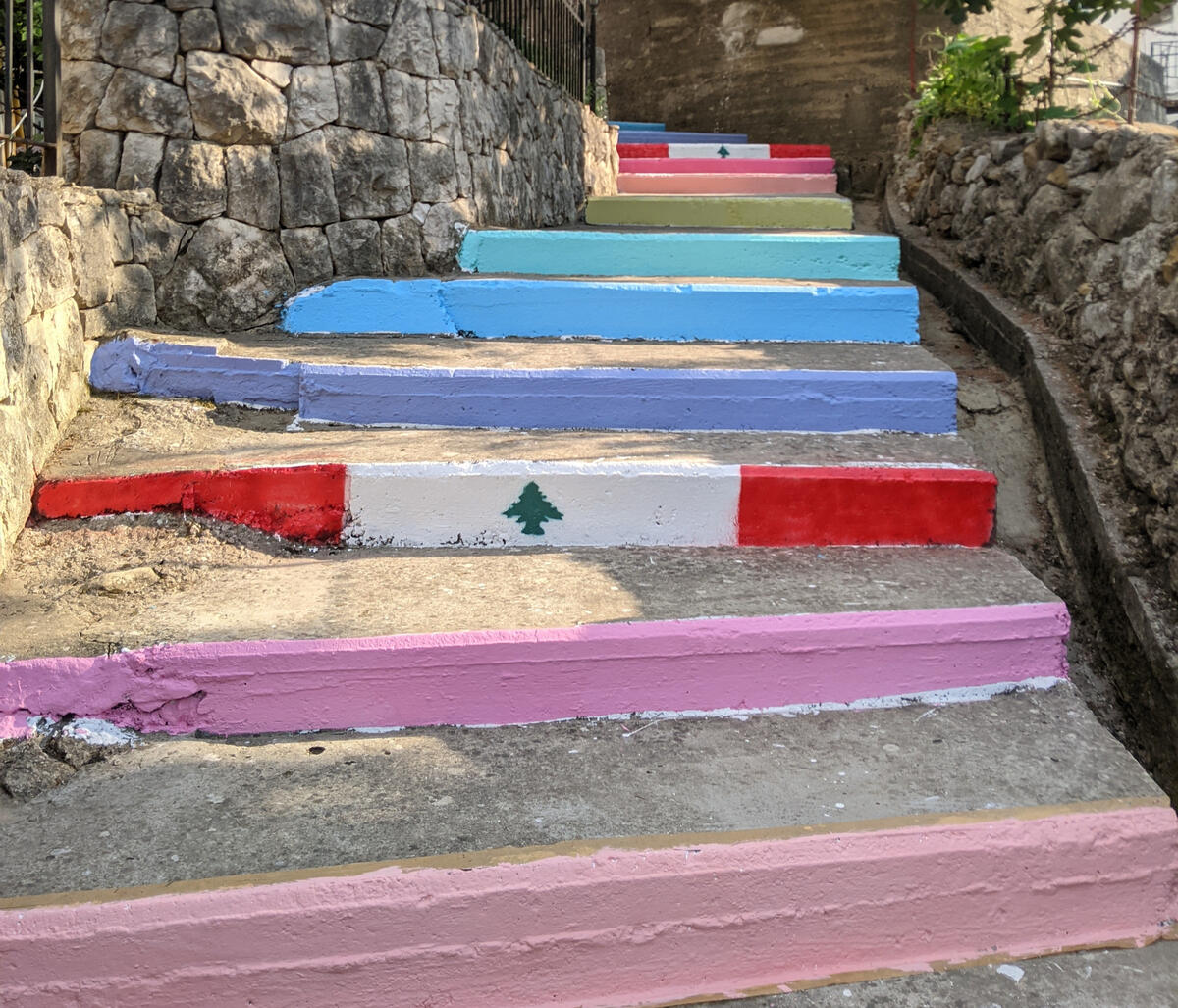 Jdeidet-Ghazir is a charming little village with potential. Throughout the village we cleaned-up, cleared-up and beautified select stairs by painting and adding color to encourage more locals to use them for basic travels and even recreational use. These walkways are located near churches and connect the village's residences to the supermarkets and shops on the main road.